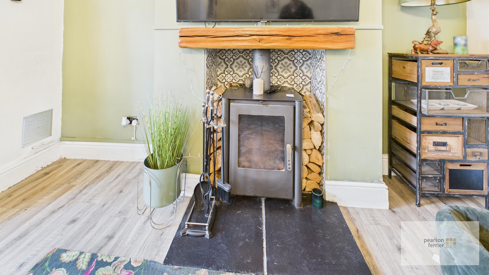 Double glazed bay window to the front, wood burning stove set in feature tiled surround, ceiling light point and radiator.