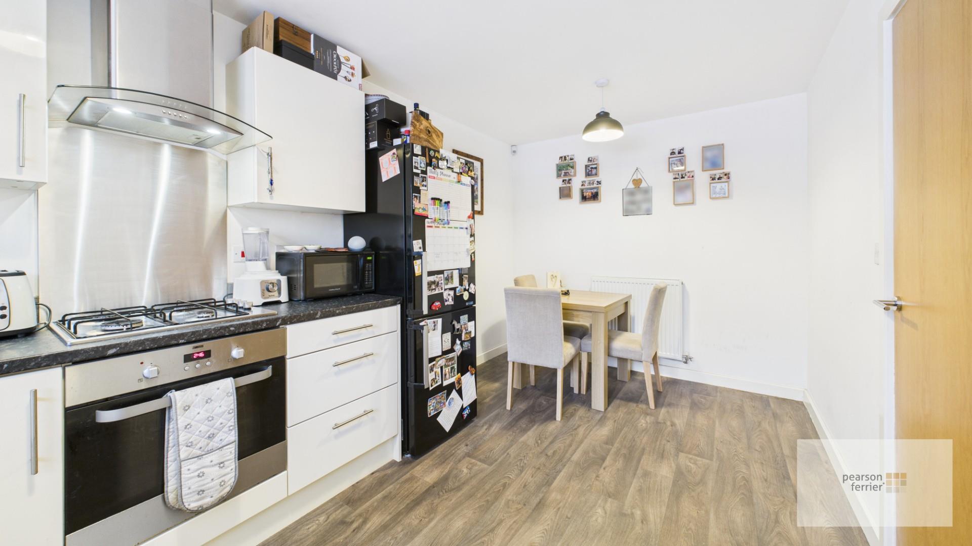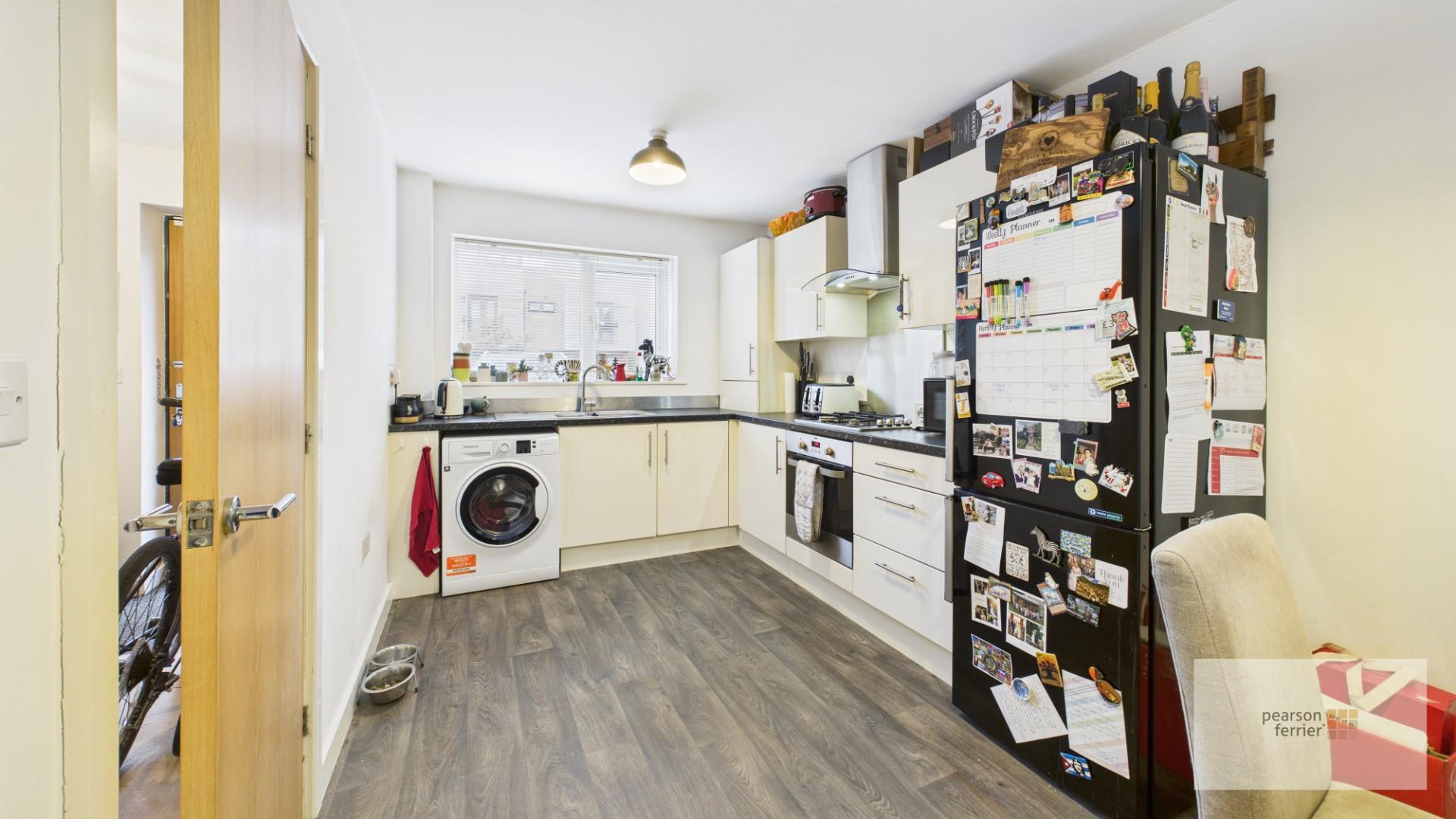 Range of wall & base units in gloss cream finish with contrasting worktops incorporating a 1 1/2 bowl sink unit. Built in appliances to include gas hob, electric oven and extractor unit. Plumbing for washer and space for fridge freezer. Vinyl flooring, upvc double glazed window to the front.