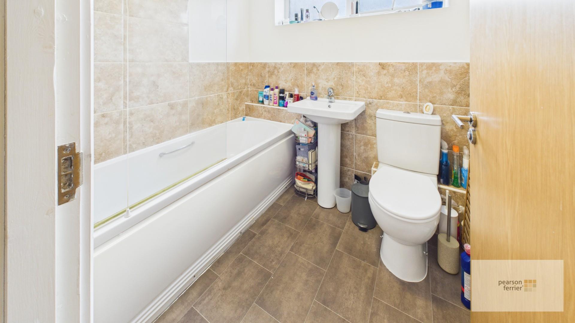 Three piece suite in white comprising: a low flush w.c., pedestal hand wash basin and panelled bath with electric shower over. Tiled splash backs and upvc double glazed window to the front.